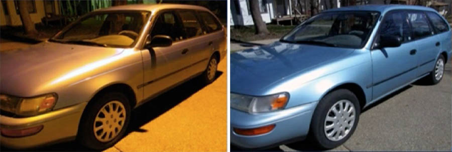 Same car under street lighting at night                                Color of a blue color under daylight