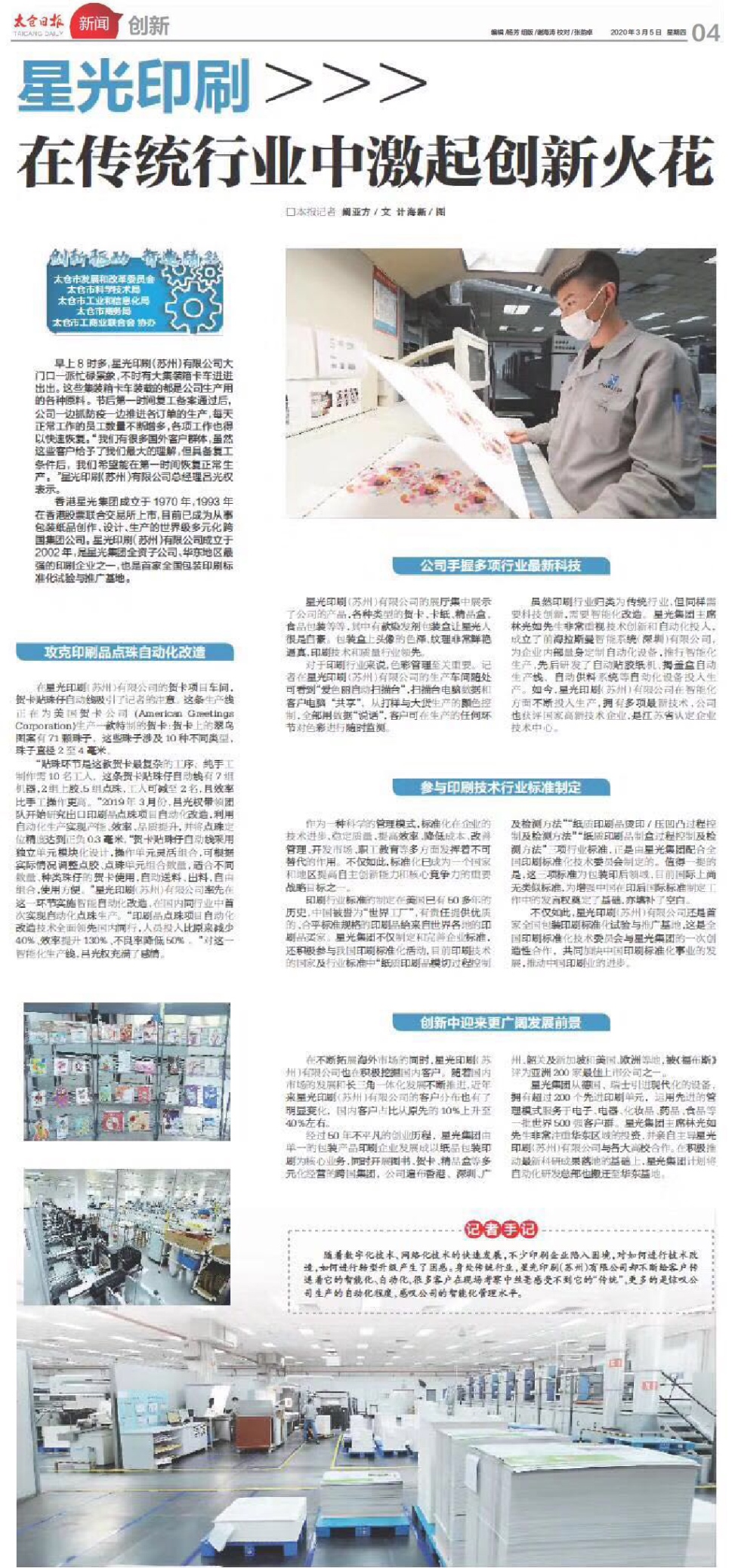 星光印刷(蘇州)有限公司卻不斷給客戶傳遞著它的智慧化、自動化,很多客戶在現場考察中絲毫感受不到它的「傳統」,更多的是驚歎公司生產的自動化程度,感歎公司管理的智慧化水準。